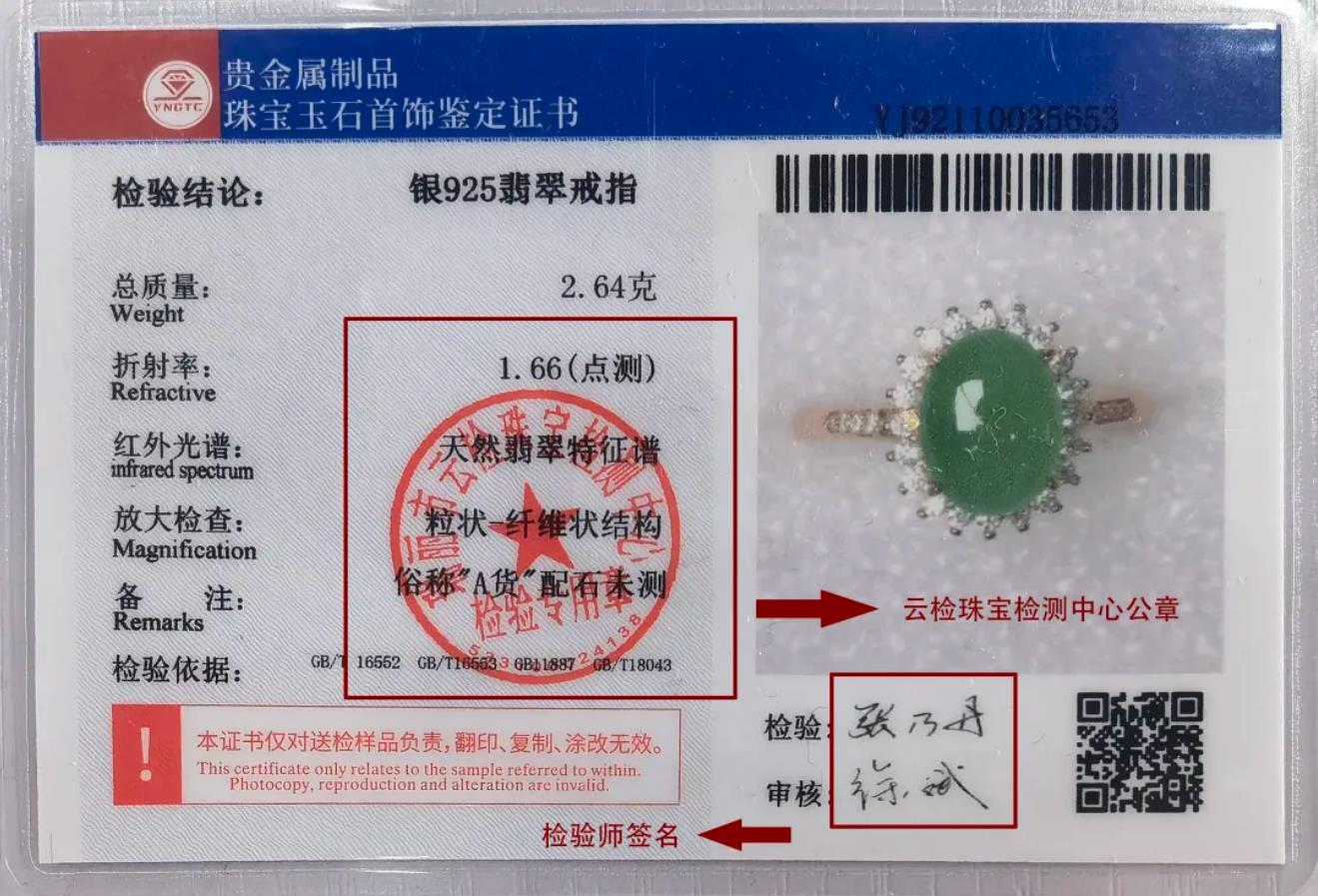 搜狐体育珠宝玉石首饰鉴定证书背面有单位公章和检验师签名